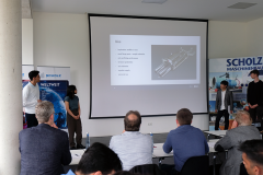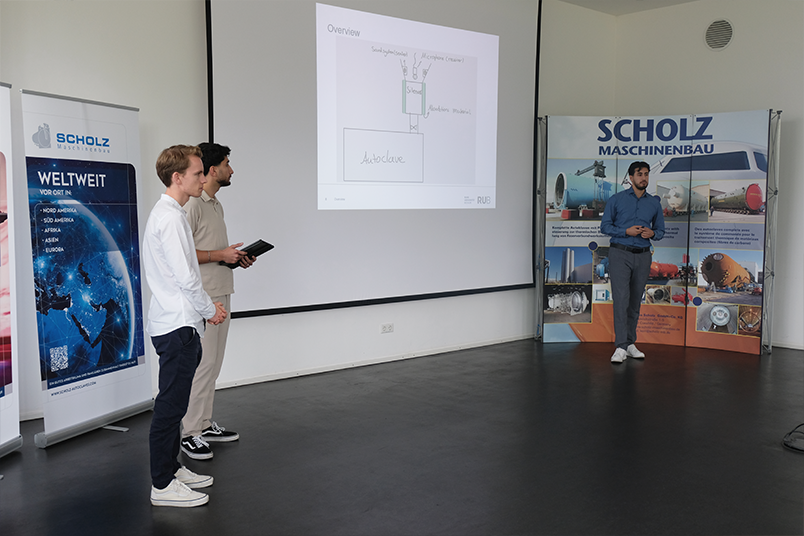 Am 2. August 2023 ging es dann bei den Abschlusspräsentationen auf dem Firmengelände der Firma Scholz Maschinenbau darum, welches der insgesamt sechs Teams den Wettbewerb für sich entscheidet. Die besondere Herausforderung dabei: Die gesamte Veranstaltung inklusive der Präsentationen wurde auf Englisch gehalten. Die Moderation der Veranstaltung übernahmen die SEPM-Studierenden Olga Bushueva und Anastasia Rosenberg.